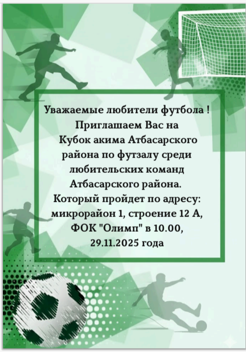 Өткен сенбі күні «Олимп» дене шынықтыру-сауықтыру кешені футзал алаңындағы қызу тартыстардың нағыз эпицентріне айналды! Мұнда Атбасар ауданы әкімінің футзалдан көптен күткен Кубогы өтіп, ауданымыздың 7 амбициясы жоғары әуесқой командасы бас қосты....